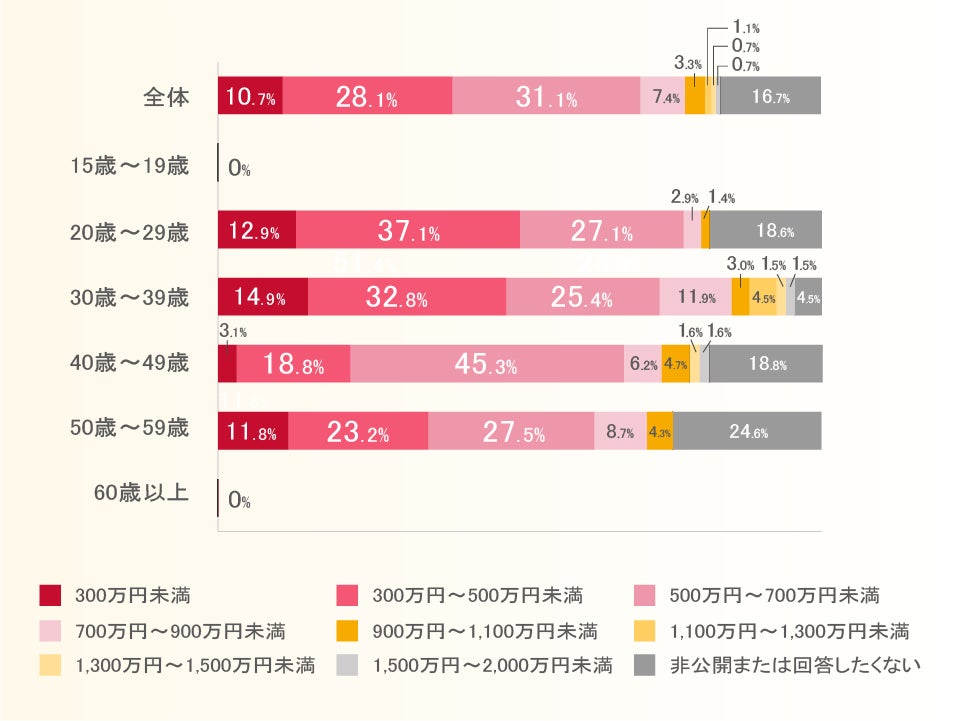 個人年収を年代別に見てみると、20代、30代のボリュームゾーンは300万円〜500万円未満であるのに対し、40代、50代では500万円〜700万円未満が最も多い回答でした。