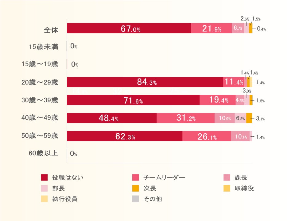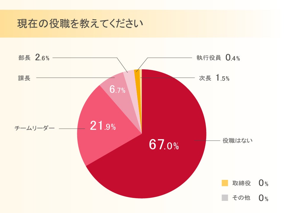 役職がない人が67%で最も多く、チームリーダーは21.9%、課長以上の役職は11.2%。