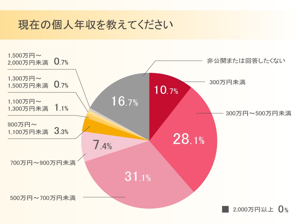 個人年収については、最も多い層は500万円〜700万円未満の31.1%で、次に300万円〜500万円未満の28.1%でした。