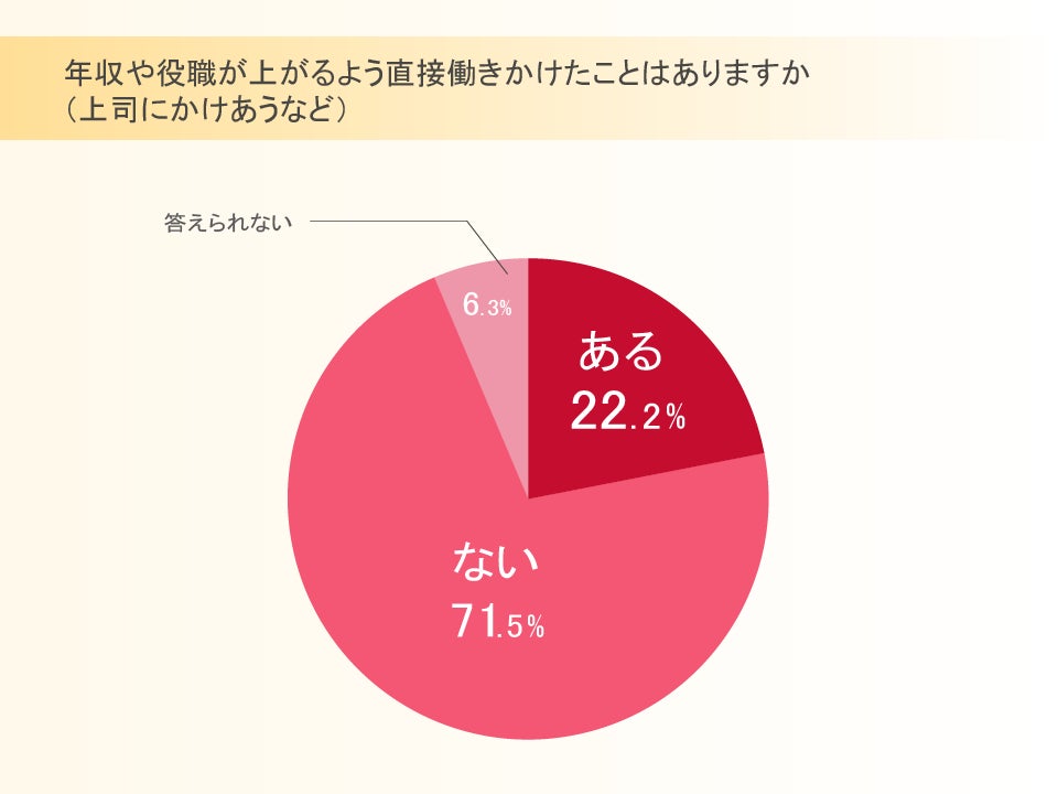 年収や役職が上がるように直接働きかけたことがあるか(上司にかけあうなど)どうかたずねたところ、あると答えたのは22.2%、ないと答えたのは71.5%でした。