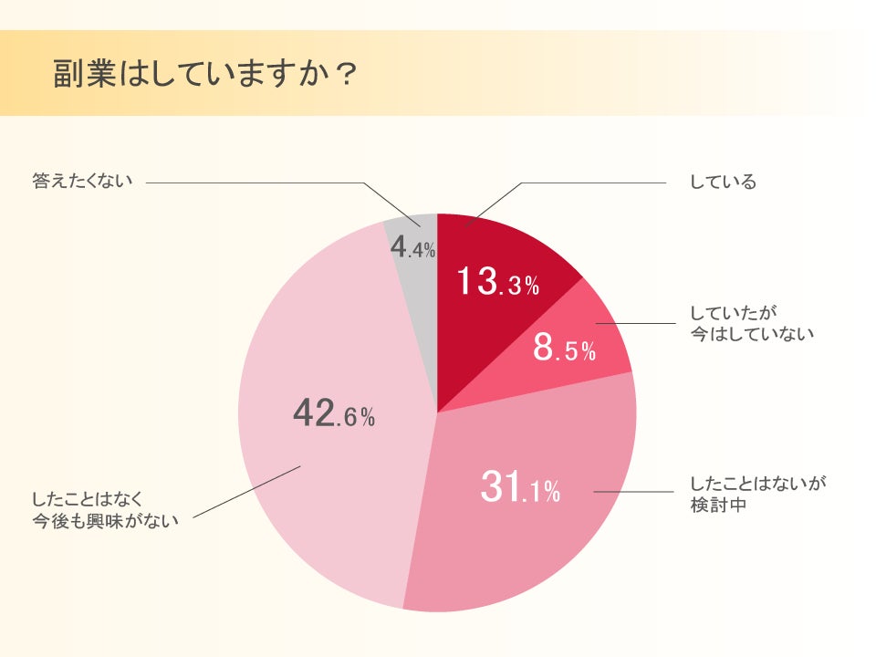 現在副業をしている人は13.3%。最も多かった回答は「したことはなく今後も興味がない」の42.6%。