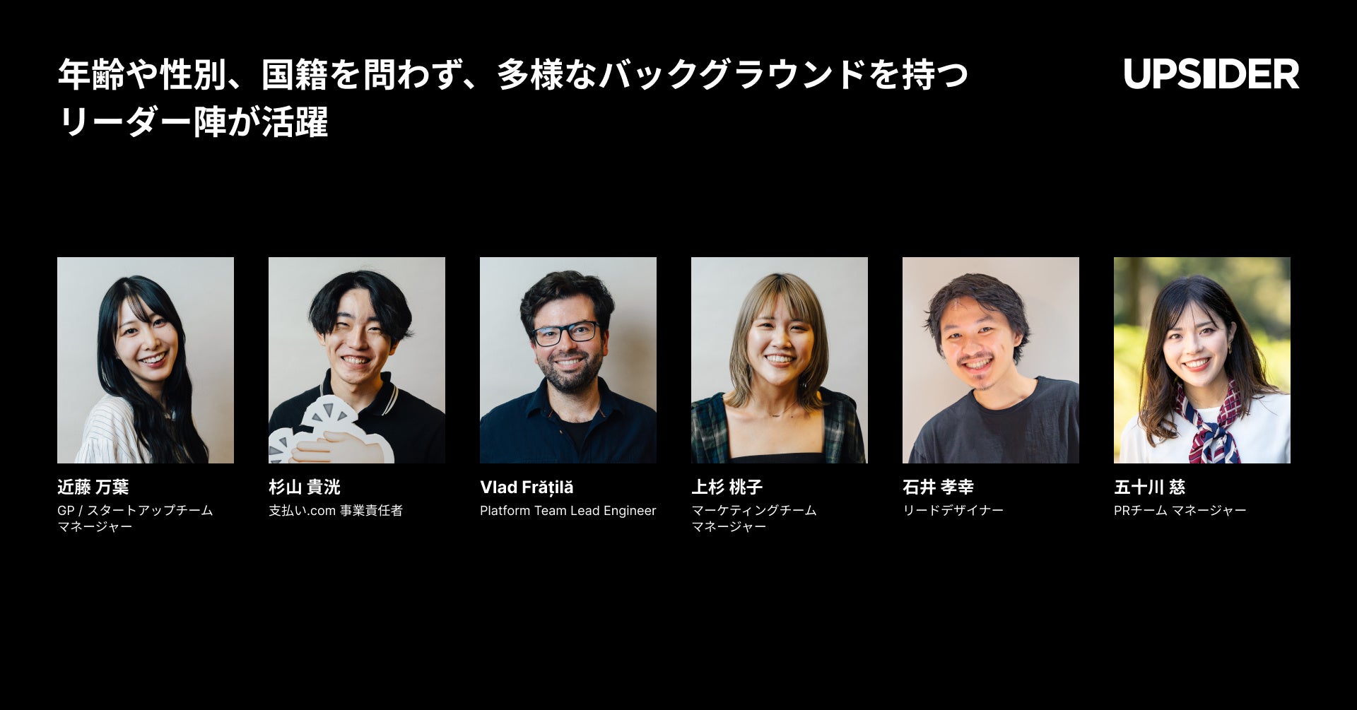 2022年、共同創業者の宮城・水野が中心となり経営をリードしてきましたが、2023年は、開発や金融のバックグラウンドを持つシニアメンバーがUPSIDERに加わり、新たな段階へと進みました。さらに、コーポレート・ガバナンス強化を目的とし、グローバルファンド WiLの伊佐山氏が社外取締役に就任。リーダー陣を、経験豊富な経営メンバーが支えています。