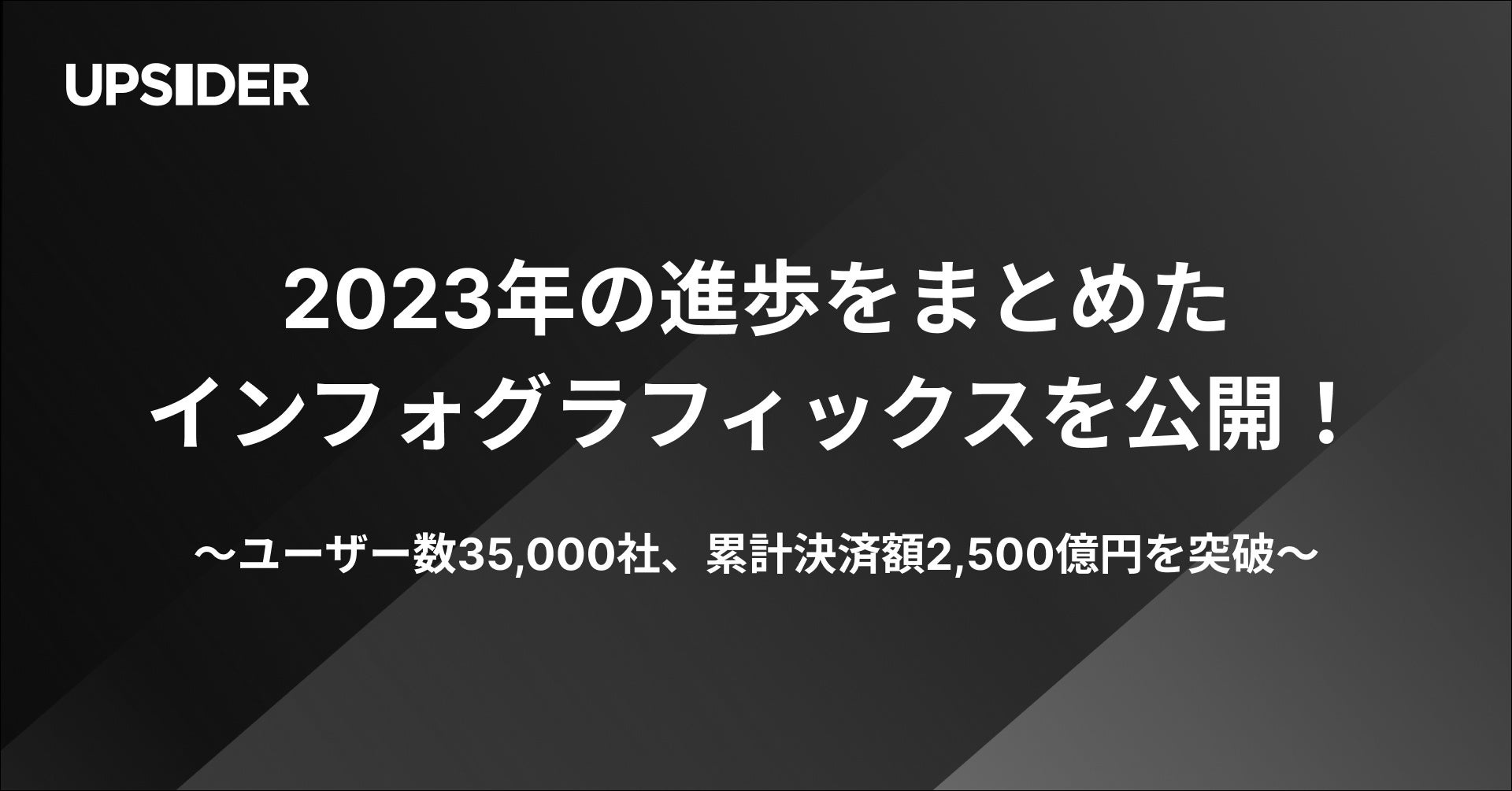 新規上場企業の20%以上が利用する法人カード*「UPSIDER」およびビジネスあと払いサービス「支払い.com」を提供する株式会社UPSIDER(代表取締役:宮城徹・水野智規、本社:東京都港区、以下 当社)は、2023年12月末時点で、当社が提供する「UPSIDER」「支払い.com」の合計導入企業数が35,000社を突破・法人カード「UPSIDER」の累計決済額は2,500億円を超えたことを発表いたします。