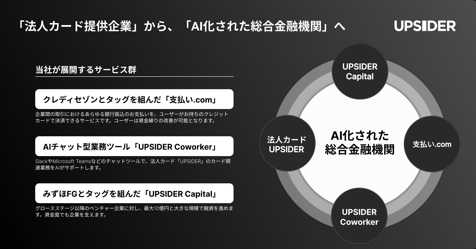 当社は、『成長企業を支援する法人カード「UPSIDER」を提供する会社』から、『世界で戦える日本企業を生み出し、日本の競争力を再び上げることを支援する、AI化された総合金融機関』へと進化してまいります。