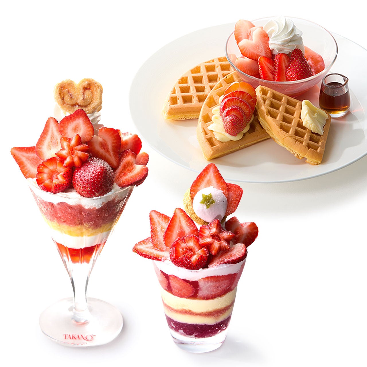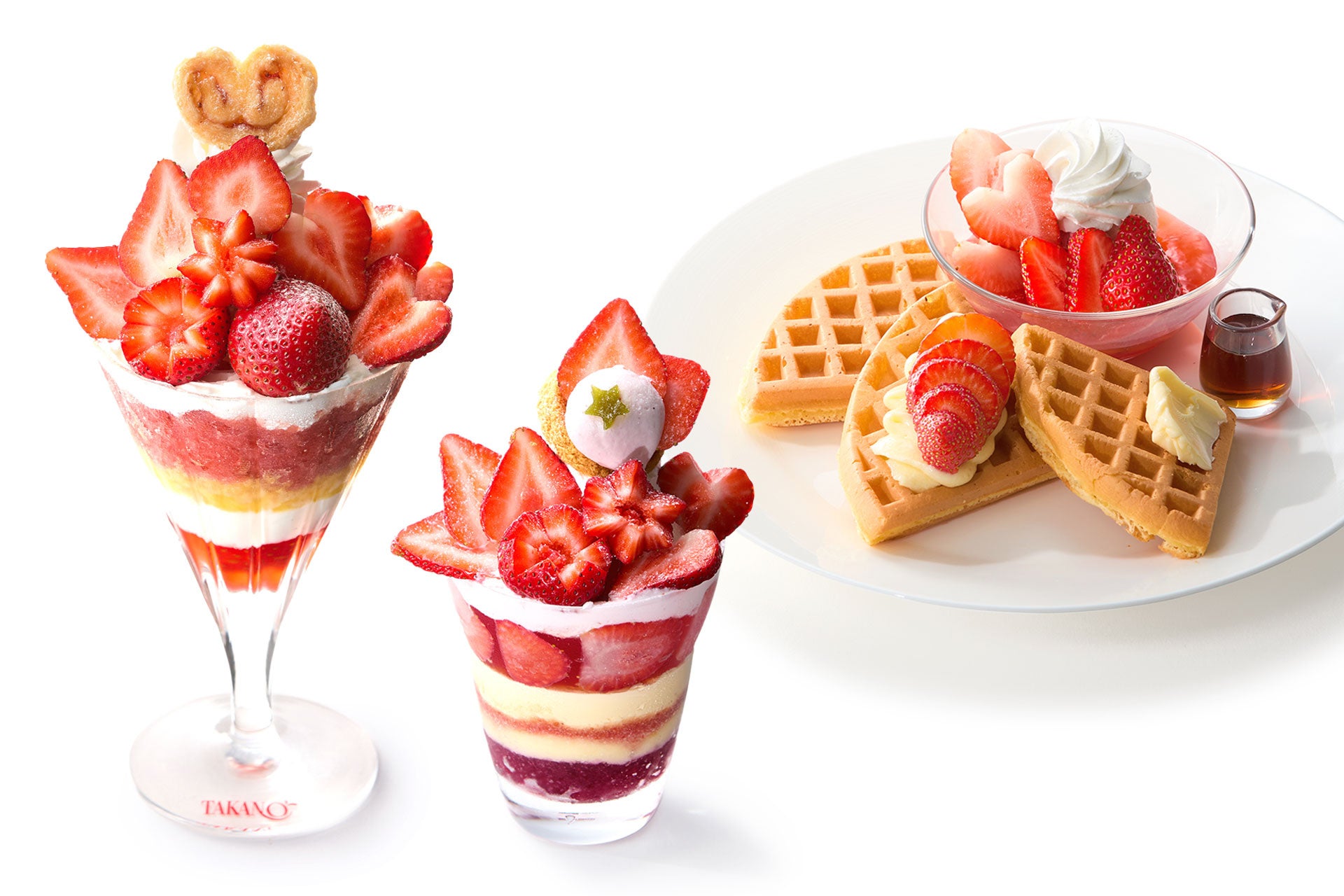 2月のおすすめメニューは「苺」。苺一色のパフェ、グラスケーキ、ワッフルや、マスクメロンとデコポン🄬を組み合わせたパフェなど、バリエーションも様々です。