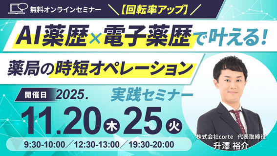 【ソラミチシステム:無料オンラインセミナー】11月20日、25日に開催!「【回転率アップ】AI薬歴×電子薬歴で叶える!薬局の時短オペレーション実践セミナー」