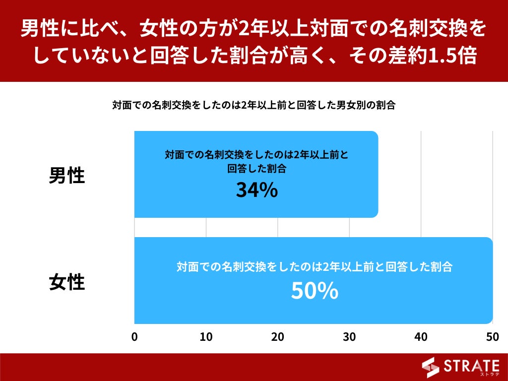 対面での名刺交換をしたのは2年以上前と回答した割合を男女別でみてみますと、男性の34%に対し、女性は50%という結果になりました。