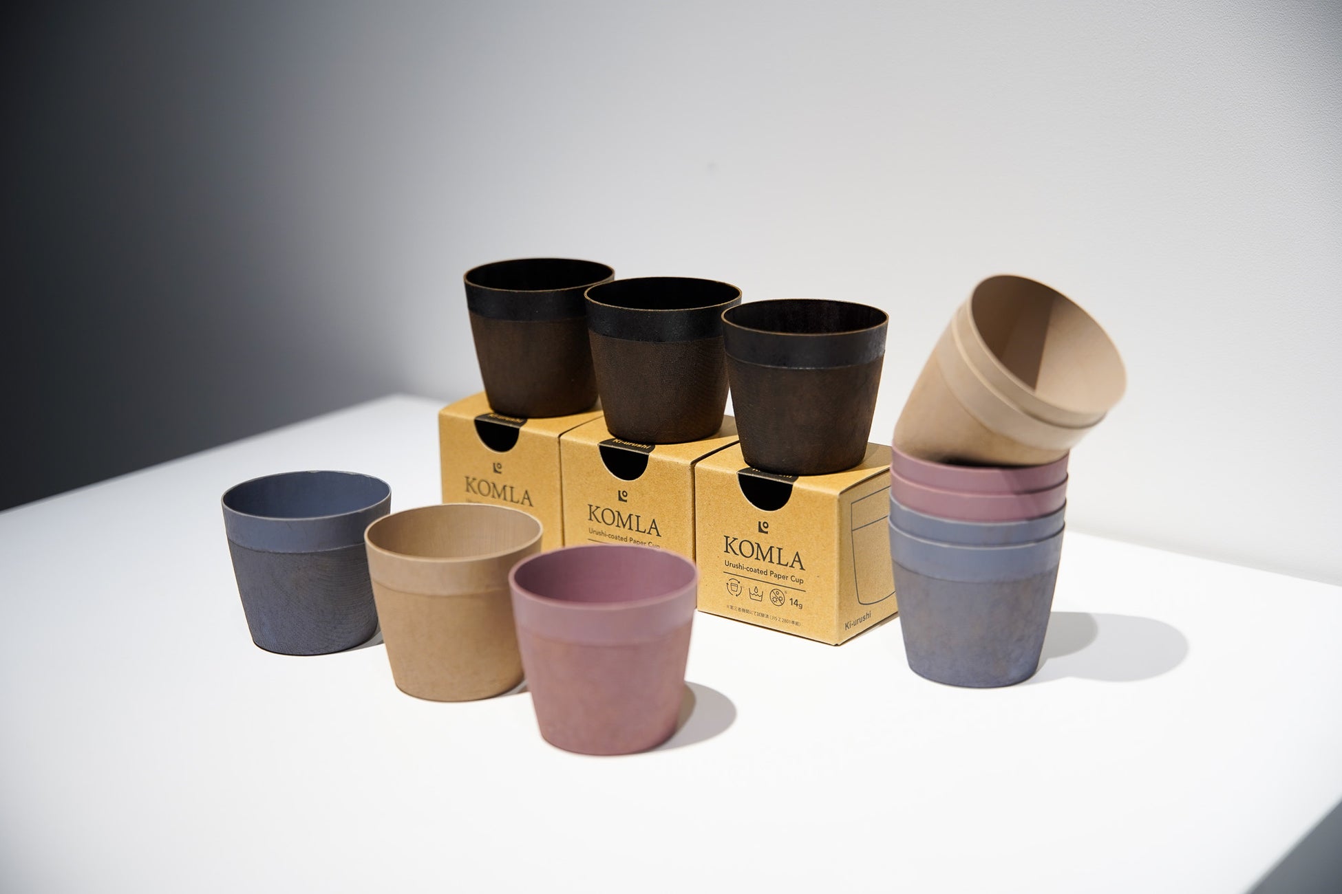 京都の伝統的な漆塗りと現代技術を織り交ぜたあたらしい漆器を製造販売するCOCOOによる、紙と漆だけで作られたうつわ「KOMLA」。わずか14gと超軽量で落としても割れない、そして一般洗剤で何度でも丸洗いできる “使い捨てない紙コップ” です。