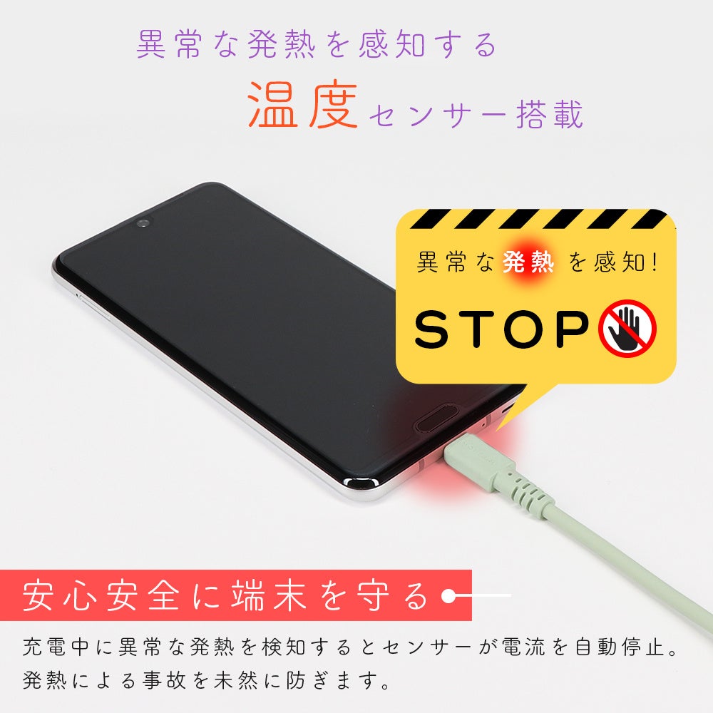 EPR準拠ケーブルで、eMarker内蔵。現在、市場に流通している100W対応の端末にもご使用いただくことができ、USB-C充電の様々なデバイスに対応しています。アウトドアで使用するパワーステーションの充電も可能です。また、温度センサー搭載で安心・安全にご使用いただけます。