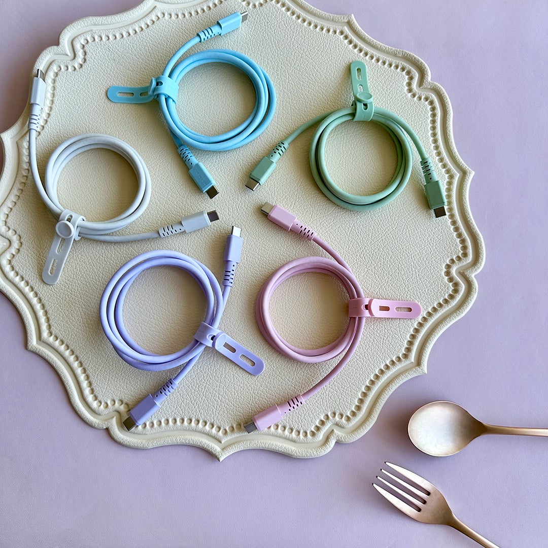 USB2.0で240Wに対応したUSB-C to USB-Cケーブルから新たに5色(アーモンドミルク、シェルピンク、ペールアイリス、パウダーブルー、ピスタチオ)が登場。240Wのケーブルは一般的に固いものが多い中、こちらのケーブルはMOTTERUのシリコンケーブルの特徴をそのまま活かし、しなやかなやわらかさを実現しています。まるで赤ちゃんの肌のようになめらかで、ずっと触っていたくなるような手触りです。