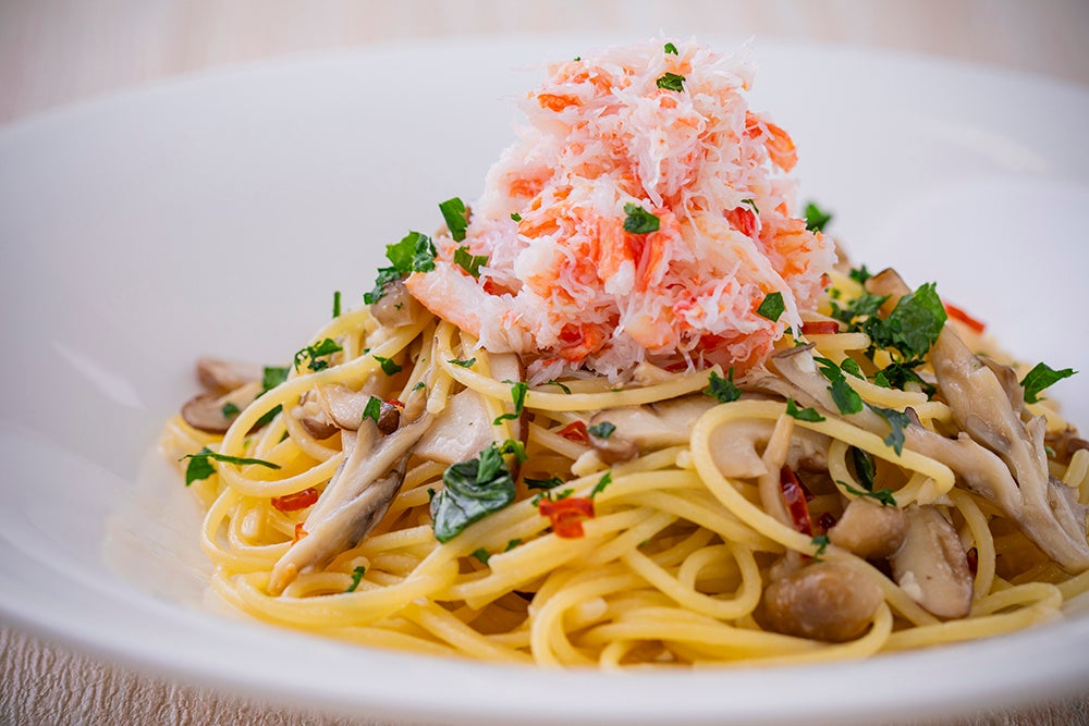 贅沢にのせる紅ズワイガニにキノコが入ったペペロンチーノ。ハーブの香りと一緒に最後まで楽しくお召し上がりいただけます。
