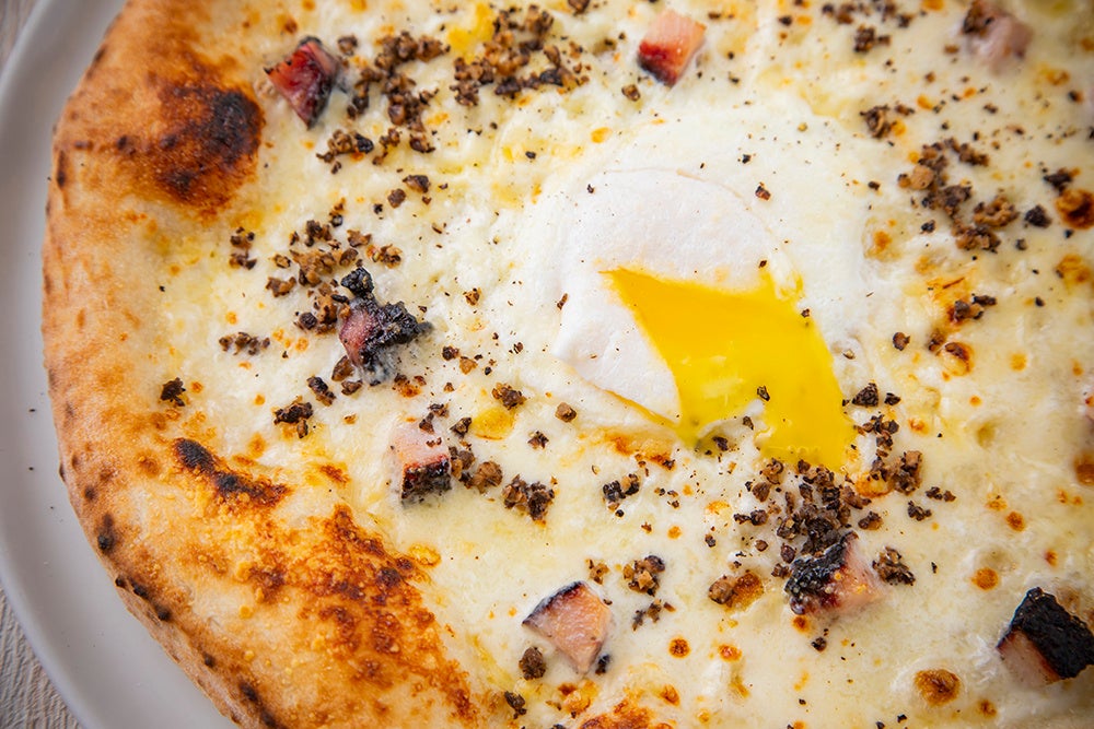 【メニュー名】黒トリュフ香る「下川六〇酵素卵」の贅沢カルボナーラピッツァ