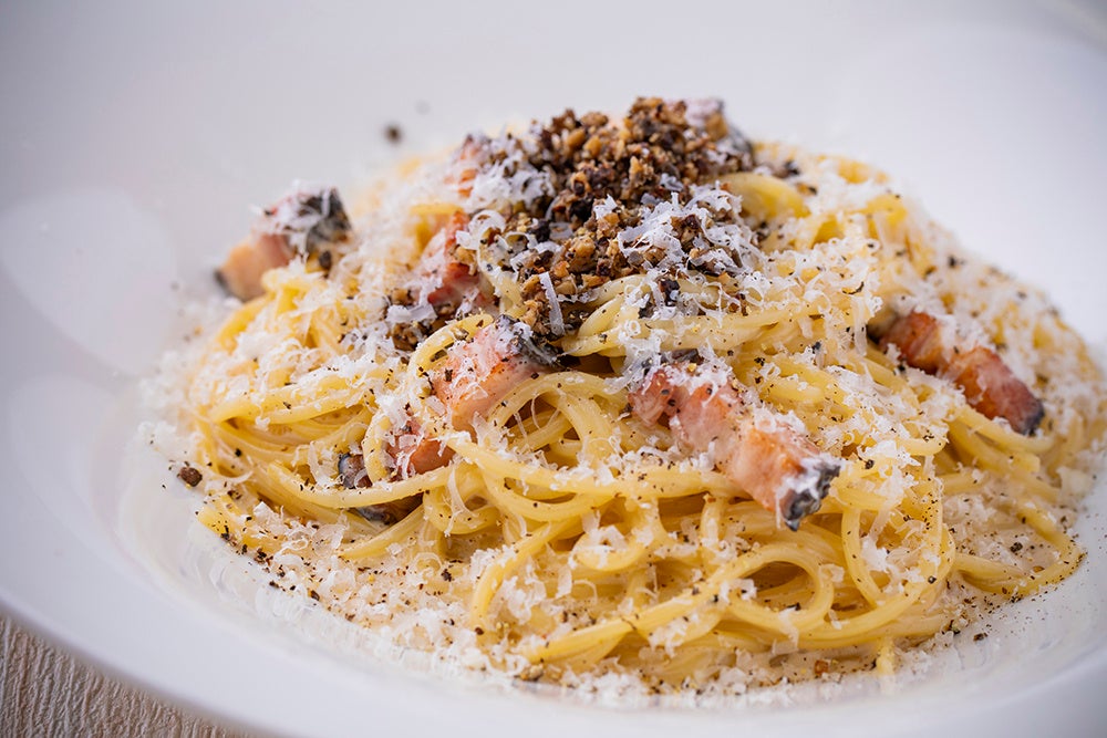 北海道下川町で酵素を食べて育つ「下川六〇酵素卵」を使ったカルボナーラに、贅沢に黒トリュフをトッピング。芳醇な香りと濃厚コク旨カルボナーラを楽しんで!
