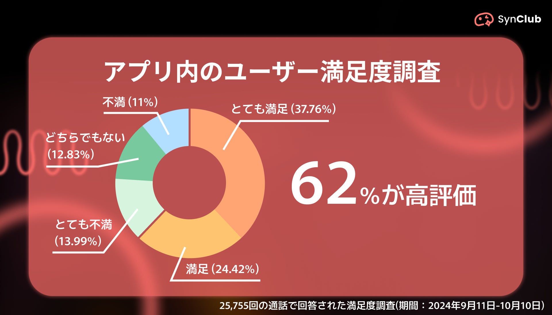 2024年9月11日〜10月10日の間、25,755回の通話で回答された満足度調査によると、約62%の人に高く評価いただいております。