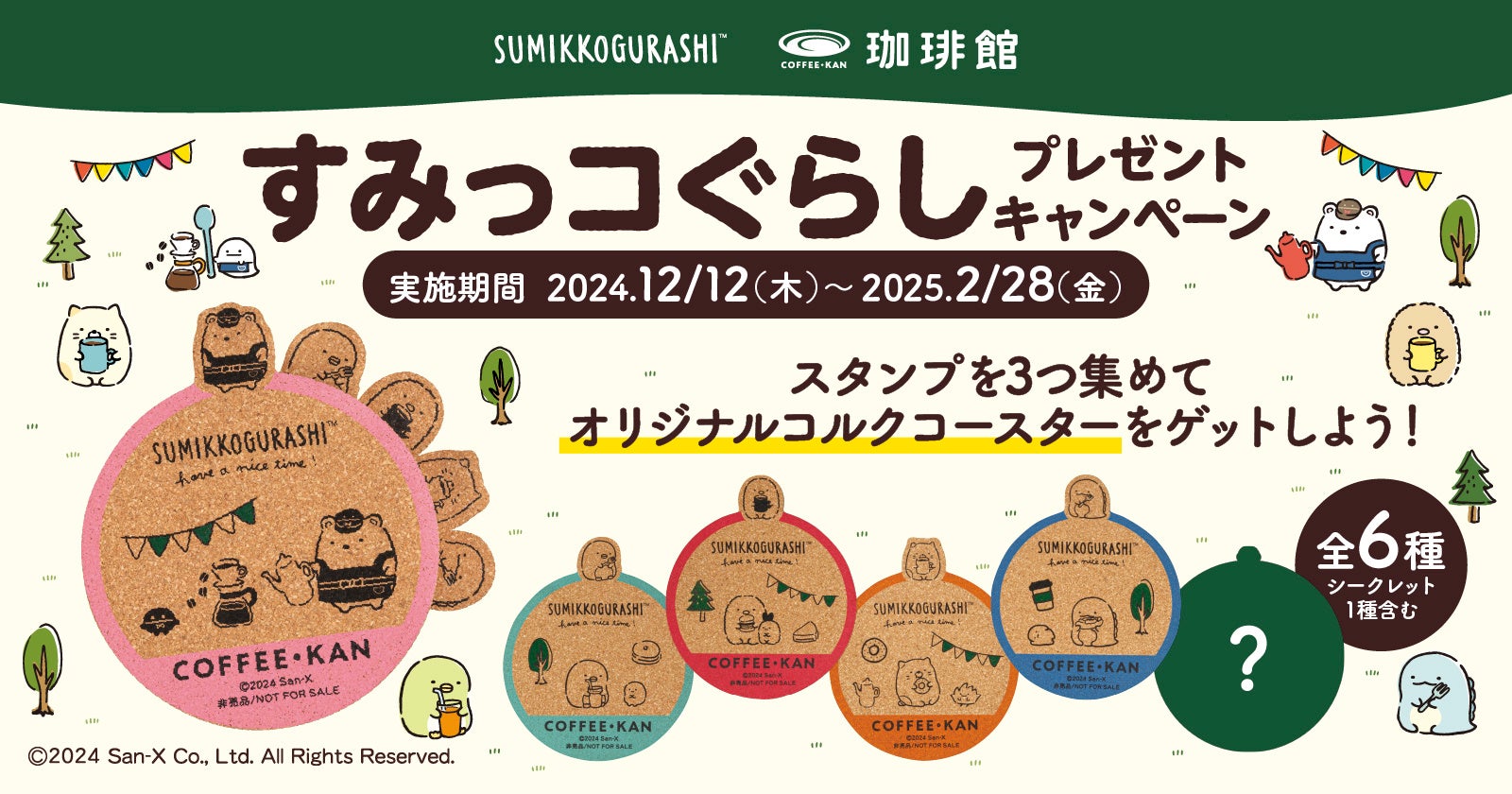 C-United株式会社(本社:東京都港区、代表取締役社長:友成 勇樹)は、全国の『珈琲館』・『珈琲館 蔵』・『CAFE DI ESPRESSO珈琲館』店頭にて、「すみっコぐらし」とのコラボ企画第2弾として、プレゼントキャンペーンを2024年12月12日(木)より開催いたします。