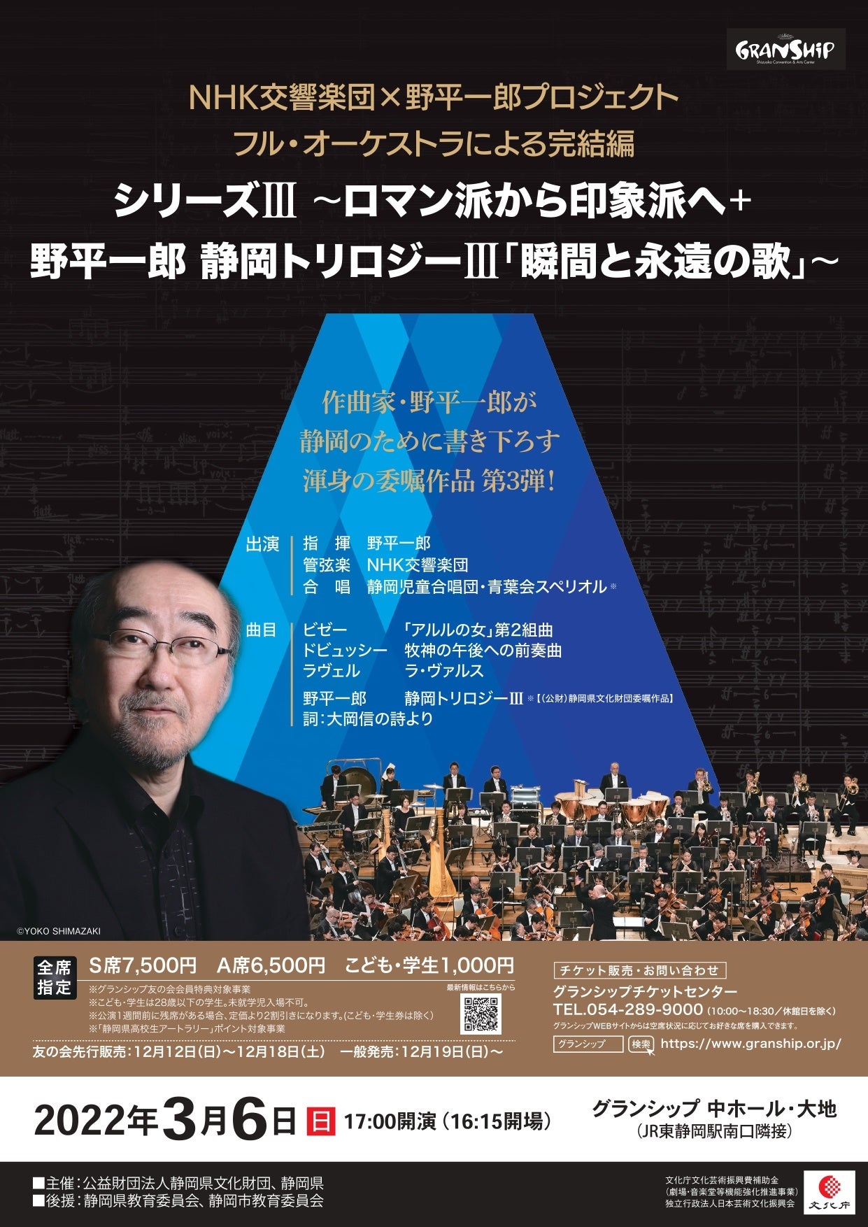 公益財団法人静岡県文化財団が、国際的に活躍する作曲家・ピアニストの野平一郎(静岡音楽館AOI芸術監督)に委嘱し、作曲された「静岡トリロジー」。その完結編となる「静岡トリロジーⅢ『瞬間と永遠の歌』」をNHK交響楽団の演奏で世界初演します。