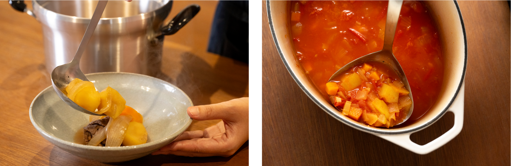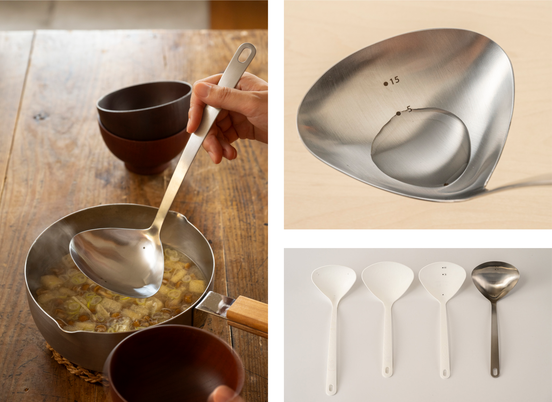 食卓に必要不可欠な縁の下の力持ち、玉杓子。毎日使うものだからこそ、本当に使いやすいものをお届けしたい。構想から2年余り、何度も試作を重ね、「ハマグリ型」に辿り着きました。横幅を広げた形状にすることで、鍋肌にぴたっと沿って、細かい具まで残さずすくえます。