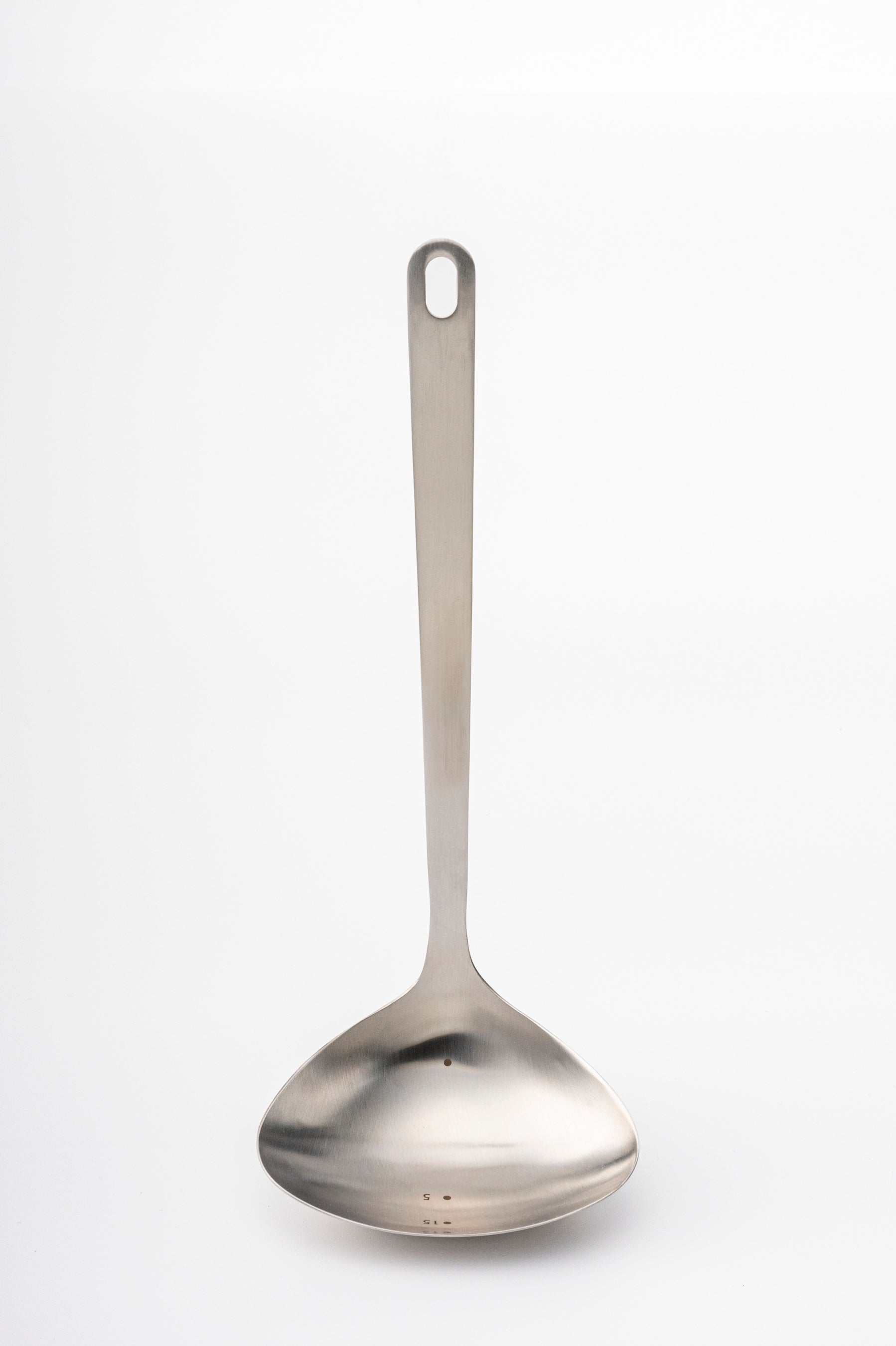 玉杓子の底には、大さじ・小さじの目盛りを刻み、レシピ通りに調味料を計れていつもの味に。計量カップやスプーンを使って洗う手間も省けます。控えめな曲線により、大きめにカットした具材を崩さず、取り分けがしやすくなりました。きれいな盛り付けまでできる、万能な玉杓子です。