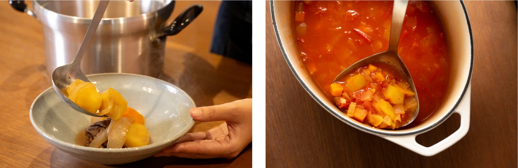 暮らしの多様化に伴い、大きな深鍋を使う機会が少ない今、持ち手は短めに調整。和洋様々な料理をすくいやすく、利き手を選びません。持ち手のカーブとしなりで扱いやすく、持ち上げるときもスムーズです。デザイナーに小泉誠さんを迎え、たどりついたデザイン。料理中の心強いお供として、自然と手に取ってしまう玉杓子が完成しました。