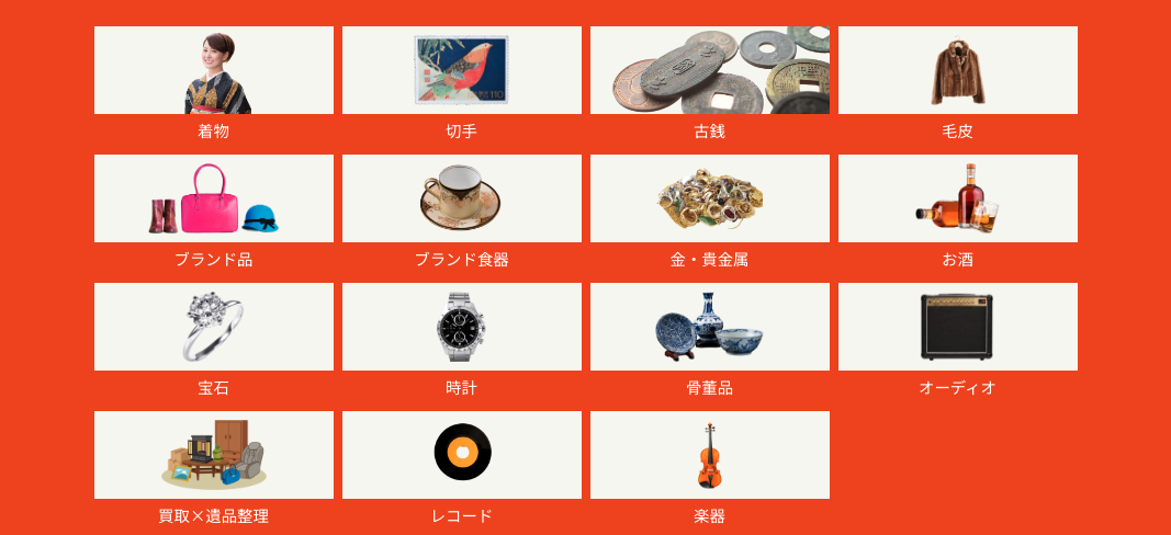 ・着物 ・切手 ・古銭 ・毛皮 ・ブランド品 ・ブランド食器 ・金・貴金属 ・お酒 ・宝石 ・時計 ・骨董品 ・家具家電 ・おもちゃ ・楽器 ・カメラ ・スポーツ用品 ・オーディオ製品 ・レコード ・遺品整理×買取 |