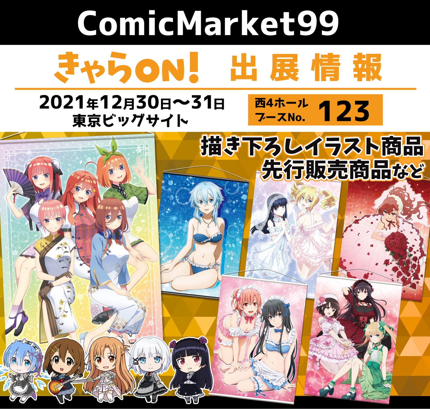 <コミックマーケット99>のきゃらON!ブースでは、『五等分の花嫁∬』『やはり俺の青春ラブコメはまちがっている。完』 『無職転生 ~異世界行ったら本気だす~』『劇場版「冴えない彼女の育てかた Fine」』 『探偵はもう、死んでいる。』『ソードアート・オンライン アリシゼーション War of Underworld』 など、