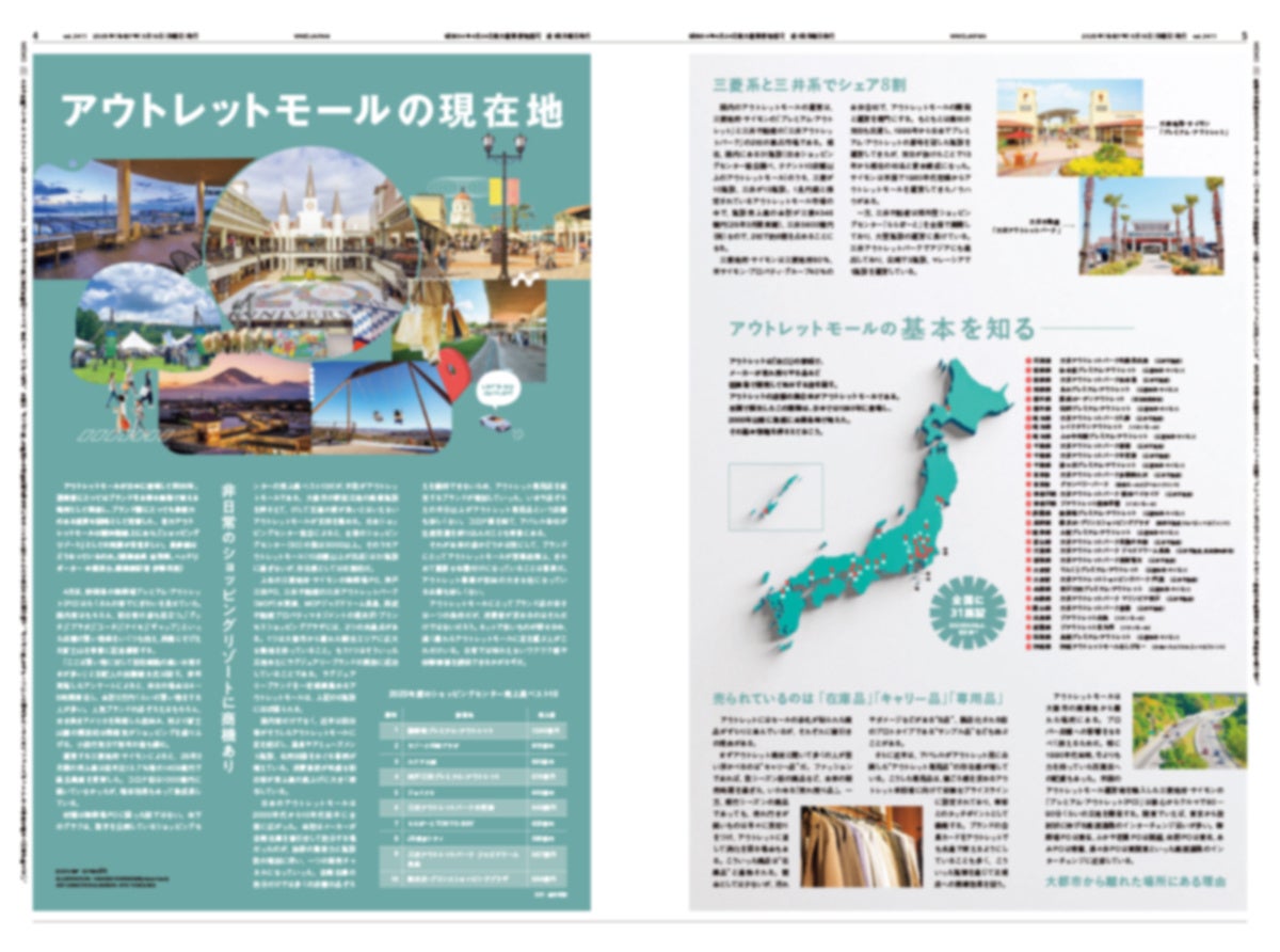 本特集では全国の有力モール取材、アウトレットに出店するファッション企業の店舗開発者による覆面座談会のほか、日本におけるアウトレットビジネスの立役者、三菱地所・サイモン社長のインタビューなどのコンテンツを盛り込みました。