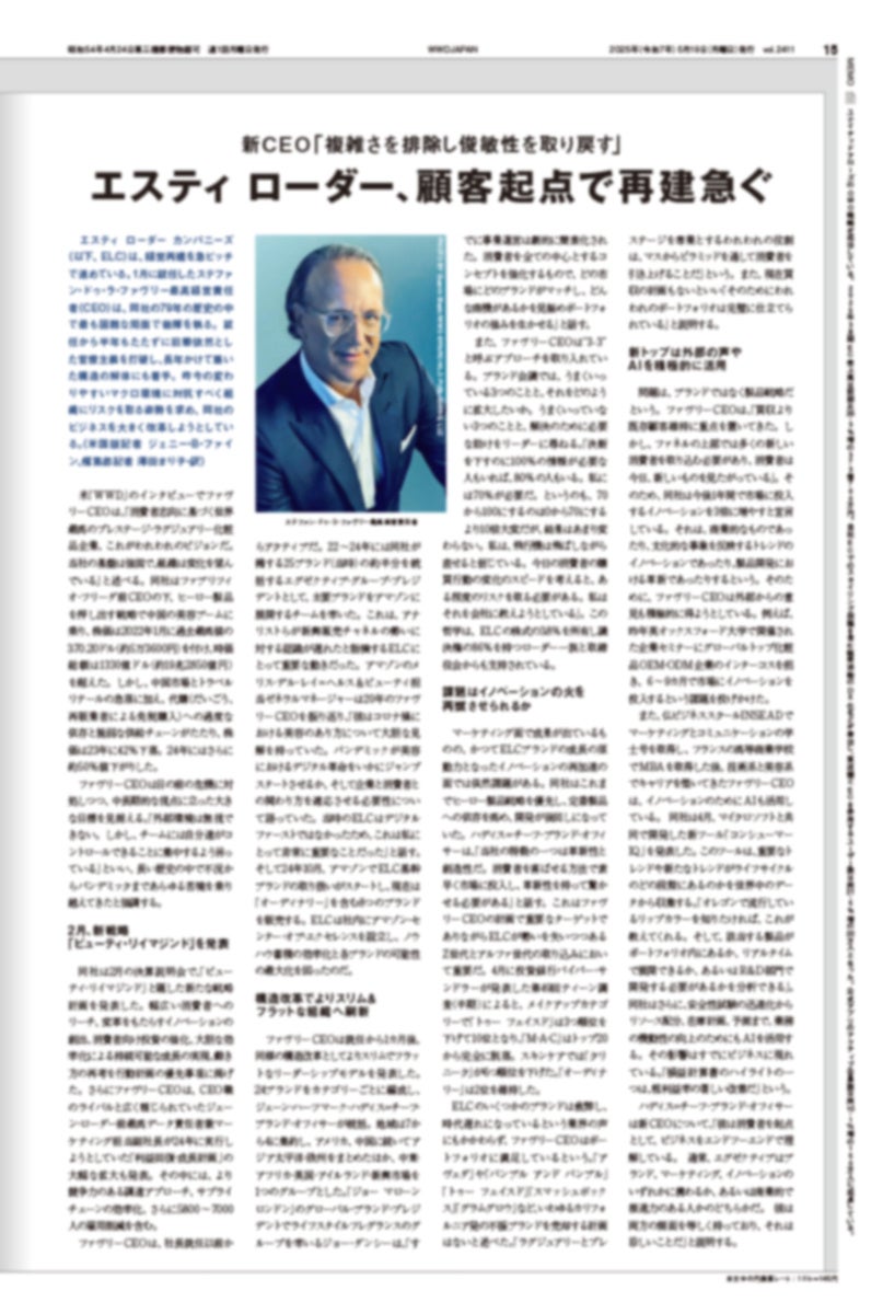 米「WWD」の翻訳記事からは、エスティ ローダーのグローバルCEOに聞く再建策をピックアップ。新戦略「ビューティ・イマジンド」や構造改革などについて聞いています。中国専門ジャーナリスト・高口康太氏による連載「中国電脳コマース趣文」では、不動産不況とトランプ関税に揺れる中国における新たな市場攻略法にフォーカス。日本ブランドの海外進出支援を手掛けるNOVARCAにノウハウを聞きました。