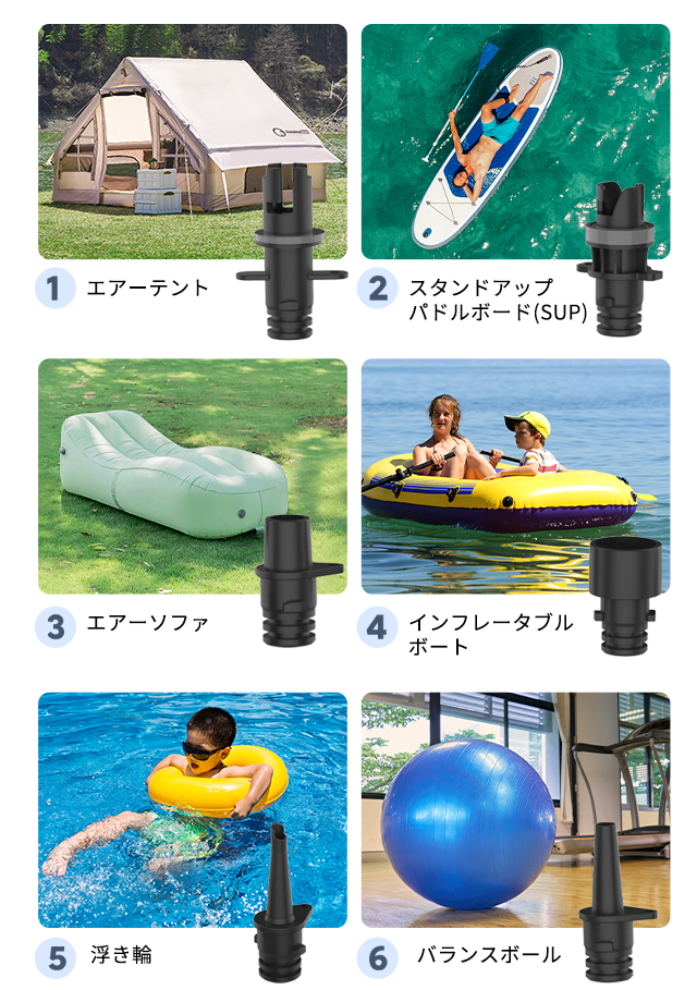 手のひらサイズなのに、「NW02-P」の対応可能な空気圧範囲は驚きの6~137kPa(1~20PSI)、最大空気流量は100L/minで、ほとんどの空気入れが必要なものに対応可能。浮き輪やバランスボールはもちろん、一般的な電動エアポンプでは対応できないスタンドアップパドルボード(SUP)でも素早く膨らませます。