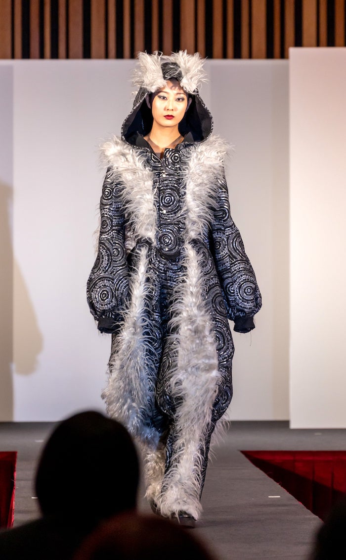 「グランプリを獲得できて本当に嬉しいです。着るだけでワクワクするような、テンションが上がるようなものを作りたいという思いで制作しました。今回初めて産地訪問をして、服や生地が機械だけでなく、これほど人の手がかかっていることに驚きました。尾州の方々の温かさや生地への愛情が伝わってきて、リサイクルウールという歴史ある技法を多くの人に広めたいと思いました。制作ではパターンとシルエットに特にこだわり、数センチ単位で調整を重ね、リハーサルでの問題点を当日朝まで修正しました。2月の名古屋TGCでステージに出展できることを光栄に思います。」