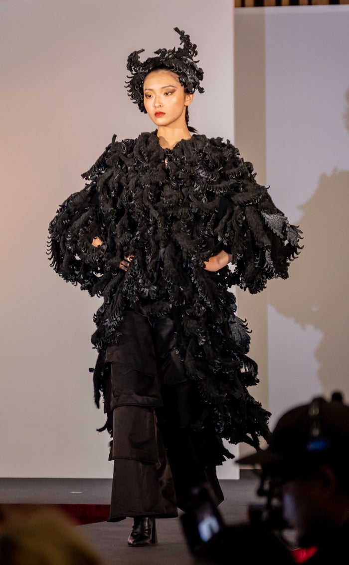 「TGC賞を受賞できて大変嬉しく思います。素材の冊子を見たときに、その生地を使って鳥を表現した服を作りたいと思いました。実際にカラスの羽を購入して観察し、布を切ると裏側の白い部分が見える効果を活かして羽を表現しています。産地訪問では、ウールの加工方法を学び、自分の作品に取り入れることができました。人の手で作る温かさを伝えられる作品になったと思います。」