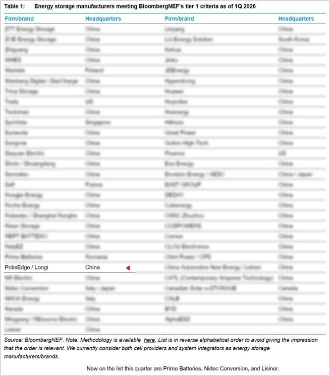 また、ブルームバーグNEFによる蓄電システムメーカーのTier 1リストにおいては、2025年11月にLONGiグループとなったPotisEdge(ポティスエッジ)との連名で選定されました。PotisEdgeとしては7期目の選定であり、LONGiとしては初めての選定となります。