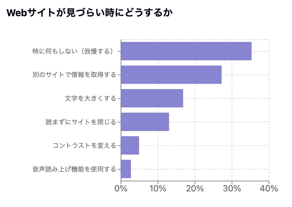 また当社が実施した障害のある方215名を対象とした調査(2024年)では、ウェブサイトの閲覧が困難な場合の対処方法について、「特に何もしない(我慢する)」という回答が最も多く、多くの方々が日常的にウェブサイトの利用に際して困難を感じている実態が明らかになりました。