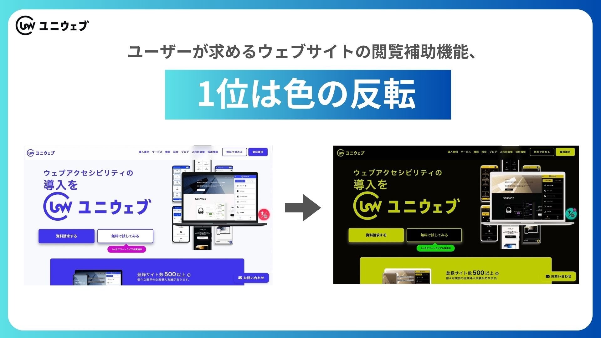「ユニウェブ」も現在500サイト以上で使われており、ウェブアクセシビリティ対応の取り組みを本格化し始めている企業が多くいる現状があります。