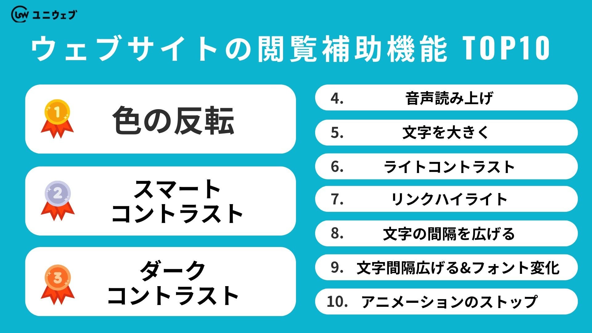 「ユニウェブ」は、ウェブサイトをより使いやすくするための支援ツール(ウェブアクセシビリティツール)です。画面の色を反転したり、文字の大きさを変更したり、文字の間隔を調整したりすることができることにより、ウェブサイトをより快適に利用できます。年齢や身体的な条件に関わらず、すべてのユーザーが平等にウェブサイトを利用できるよう、サービスを提供しています。