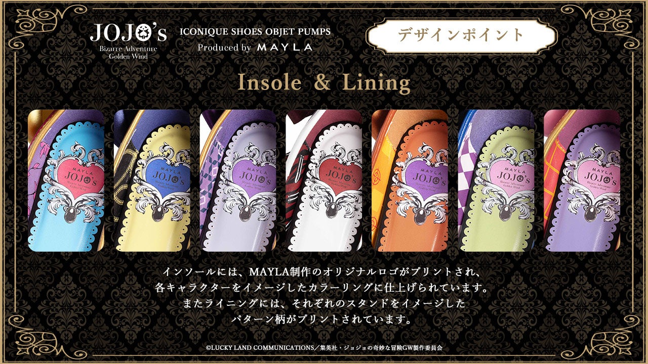 この度、MAYLAはアニメ『ジョジョの奇妙な冒険 黄金の風』に登場するジョルノ達7人をイメージしたアイコニックなパンプスをプロデュースしました。黄金の風の世界観を、MAYLA独自の感性で落としこみ、ラグジュアリーで美しいデザインに仕上げております。