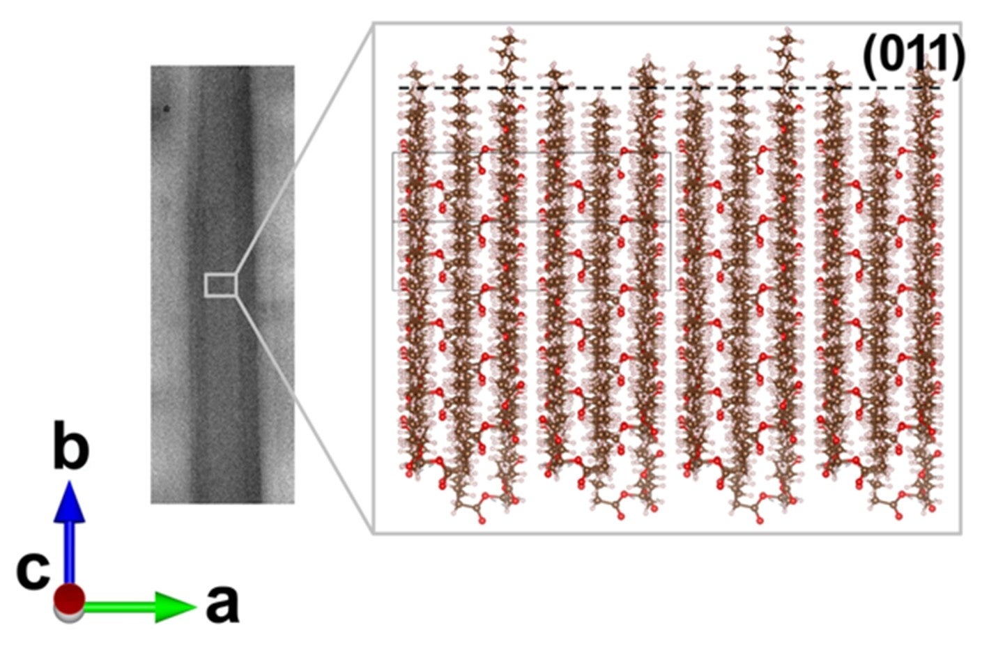 本研究では、0.5 wt%のPSPを含むオレオゲルについて、TEMを用いた詳細な観察を行いました。その結果、顕微鏡下で確認されていた細長い繊維状結晶は、幅約450 nm(ナノメートル)の真っ直ぐな晶出物であることが分かりました。晶出物とは、溶液や融液中から固体(結晶)が分離して取り出された物質のことを指します。本研究では、脂質ウィスカー結晶がこれに該当します。規則的な点状の像が現れる電子回折パターンが確認され、これは単結晶特有の特徴であることから、本晶出物が単結晶であることが明らかになりました。(図1)この特徴は、材料科学で知られるウィスカー結晶そのものです。電子回折パターンを解析した結果、この脂質ウィスカー結晶は(011)面という特定の結晶面に沿って伸びて成長していることも分かりました。(図2)またオレオゲルのマクロな物性を評価するため、粘弾性測定を行ったところ、温度制御(テンパリング)を行ったサンプルは、行わないサンプルに比べて、ゲルの硬さの指標となる貯蔵弾性率(※11)が約7倍と大きく、また、安定性の指標となるゲルからゾルへ変化するのに必要な歪みも約6.5倍大きくなることが判明しました。これらの結果は、脂質ウィスカー結晶を含むオレオゲルが高い機械的強度を持つことを示しています。温度制御(テンパリング)によって晶出した脂質ウィスカー結晶が単結晶として強固な骨格を形成することで、高い機械的強度と安定性がもたらされたのです。なお、温度制御を行うことで強度と安定性の高いオレオゲルが得られることは、これまでの先行研究でも示されており、本結果はそれを裏付けるものです。