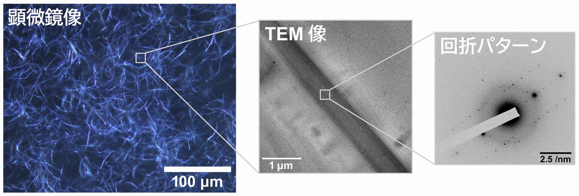 研究グループは、ゲル化温度を制御することで、低濃度のトリアシルグリセロールを用いたオレオゲルの作製に成功しました。トリアシルグリセロールは、食品に広く使われており、植物性ワックスよりも食品に利用しやすいという利点があります。特に、トリアシルグリセロールから構成されているFHHPMF(※9)(主要成分PSP※10)をわずか0.5 wt%添加するだけでゲル化すること、そしてこの際に一般的な針状結晶ではなく、細長い繊維状結晶が観察されることを見出していました。材料科学において、このような細長い繊維状結晶は「ウィスカー結晶」と呼ばれ、原子が規則正しく整列した「単結晶」であり、内部にずれや乱れ(結晶欠陥)がないため、非常に高い強度や耐久性といった機械的特性を発揮することが知られています。しかし、オレオゲル中で観察されたこの繊維状結晶が本当にウィスカー結晶であるかは、実験的に証明されていませんでした。