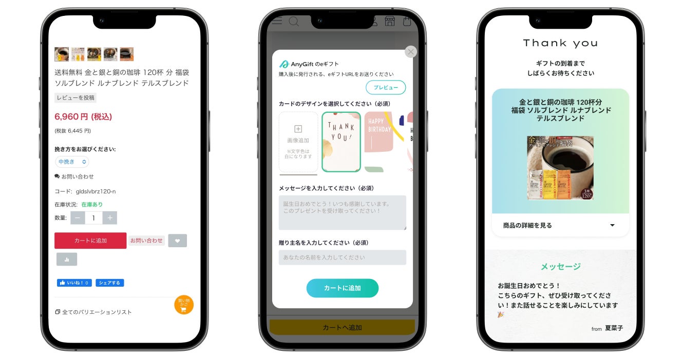 AnyGiftは、相手の住所を知らなくてもLINEやメールで贈ることができる"eギフト機能"を、ECサイトに組み込むことができるサービスです。