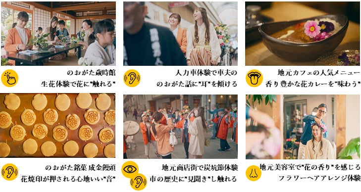 従来は主に見て楽しむ=視覚でのおもてなしを担っていた「花」を「文化」としてより多面的にとらえ、視覚(見て)・嗅覚(香りで)・触覚(触れて)・聴覚(音で)・味覚(食べて楽しむ)と五感全てで楽しめるおもてなしに昇華する。それがのおがた市の「花文化都市」であり、今後複数年かけて市と市民が一体となってビジョンの実現に向けて邁進していきます。ビジョンムービー内では、実際に花文化によるおもてなしが浸透した5年後の未来ののおがた市で、実際の市内の飲食店や観光スポットで検討中の五感で楽しめる様々な花体験を描いています。
