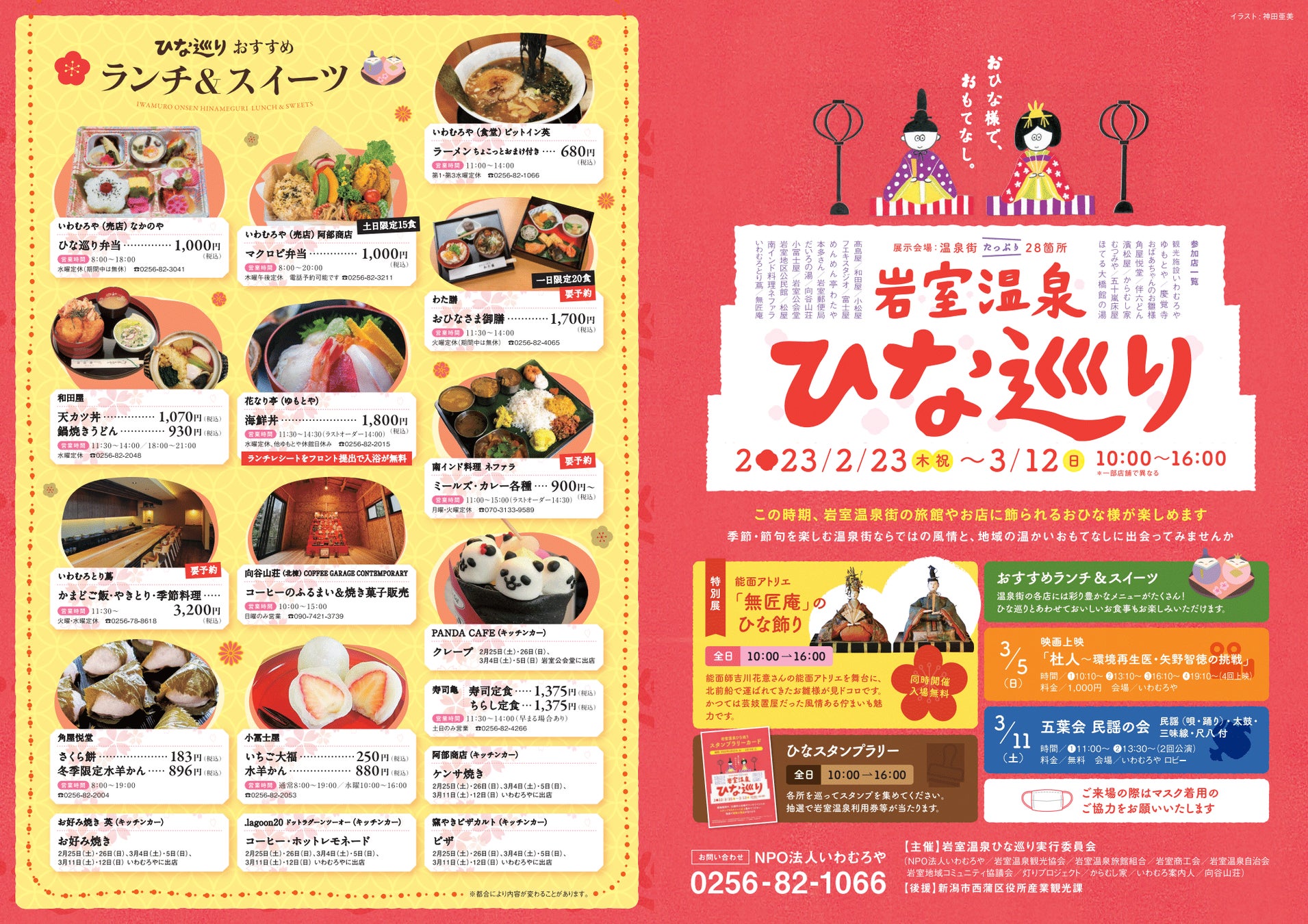 ・ひなスタンプラリー:展示会場各所を巡って、設置されているスタンプを応募用紙に押して投函すると、抽選で岩室温泉利用券等が当たります。