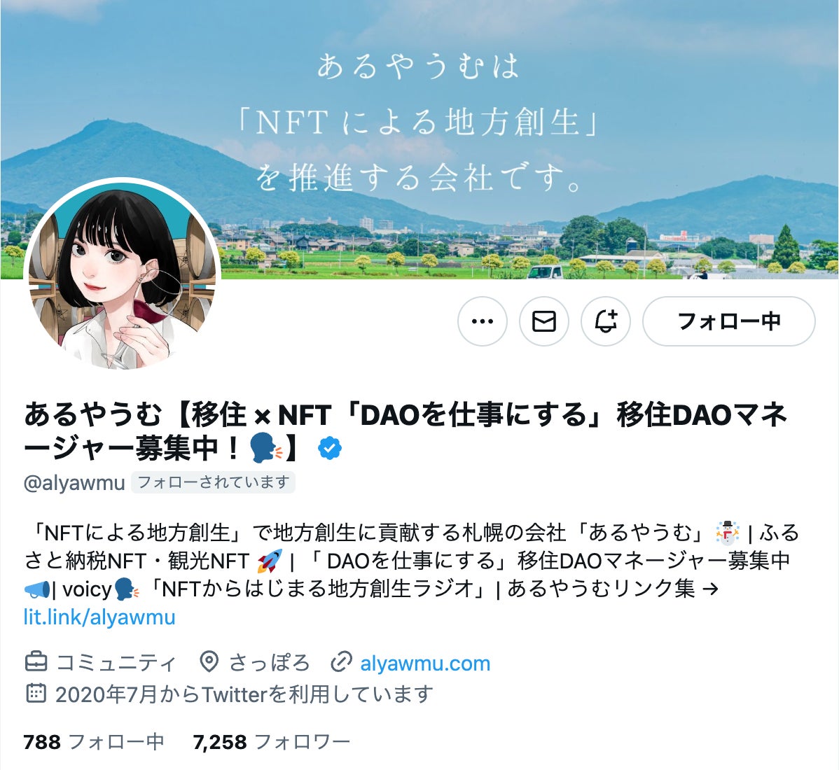 「NFTによる地方創生」を推進するため、全国の自治体向けにふるさと納税NFT/観光NFT/地域おこし協力隊DAOソリューションを提供する札幌発のスタートアップ。地域の魅力をのせたNFTをふるさと納税の返礼品とすることや、地域でDAOを運営することを通じて、新たな財源を創出すると共に、シティプロモーションや関係人口の創出に繋げます。社名「あるやうむ」はアラビア語で今日を意味する言葉。今日、いますぐチャレンジをしたい自治体・地域の皆様にNFTという先端技術を提供し、応援され続ける地域づくりを支援します。