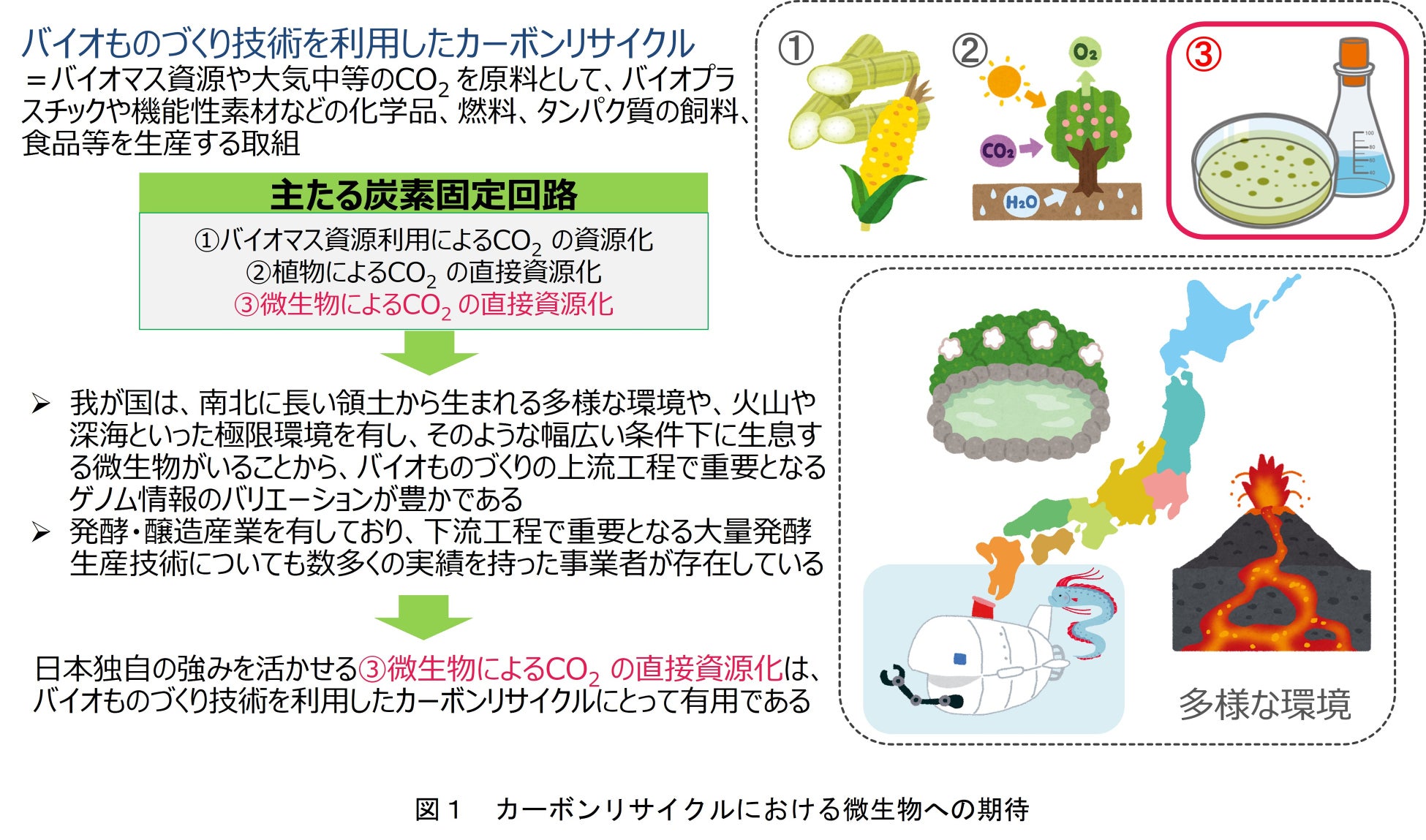 我が国は、2050年までにCO2などの温室効果ガスの排出を全体としてゼロにする“2050年カーボンニュートラル”を宣言し、これを実現するための産業政策を日本の成長戦略として位置づけています。こうした中で、水素酸化細菌などCO2を直接利用する微生物によって工業製品の素材等を生産する“バイオものづくり”が注目されています(図1)。