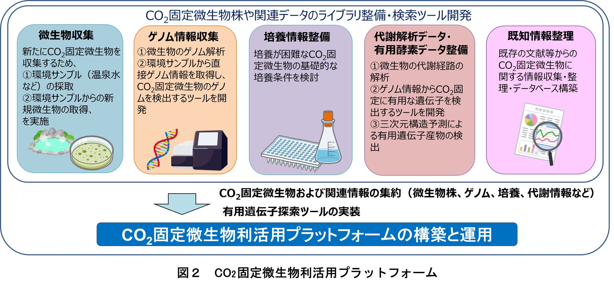 具体的には、CO2を利用して生育できる多種多様な微生物を収集して約1,000株を提供できる体制を構築することを目指します。また、各参画機関の強みを活かし、CO2を原料として利用するために必要な遺伝子情報や機能情報を整備するとともに、これらの情報の利活用を支援する情報検索ツールも併せて開発します。さらに、本事業で得た微生物情報及びその関連情報と、開発した検索ツールを一元的に収載した「CO2固定微生物利活用プラットフォーム」を構築し、公開します(図2)。