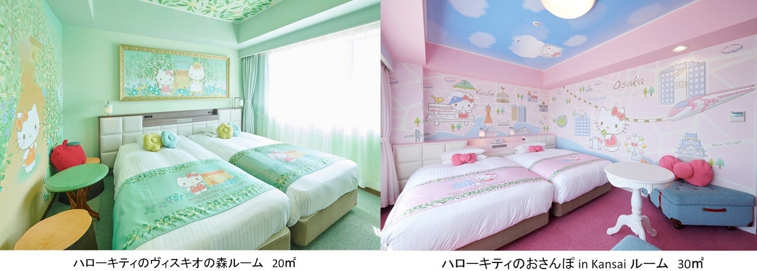 ホテルヴィスキオ尼崎のハローキティ ルームは、2019年10月19日より販売開始し、今年で3年を迎えます。大人かわいいグリーンの「ヴィスキオの森ルーム」とポップでキュートなピンクの「おさんぽ in Kansaiルーム」のデザインが違う2タイプあり、部屋中に描かれたハローキティが旅の疲れを癒してくれます。