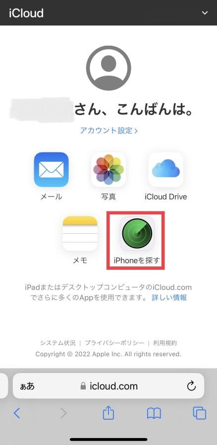 Step1:iPhoneやPCなどの他のデバイスでiCloud(icloud.com)にサインインし、「iPhoneを探す」を開きます。