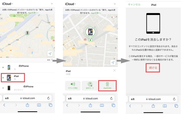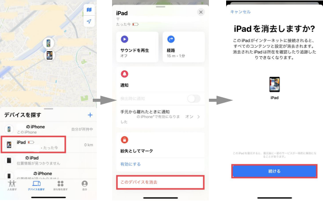 Step2:初期化したいiPadを選んで、「このデバイスを消去」>「続ける」の順に選択し、画面の指示に従って操作を進めることで、iPadを初期化できます。