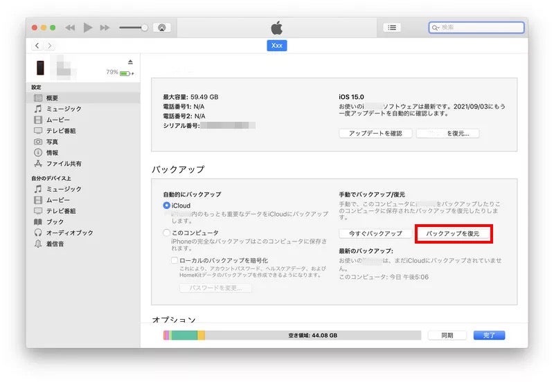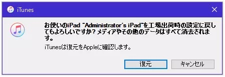 Step2:確認画面が表示されますので、「復元」を選択します。iTunesの画面が切り替わったら、初期化完了です。