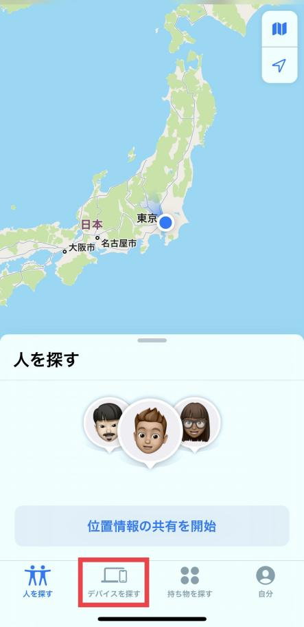 Step1:他のiOSデバイスの「探す」アプリを開き、「デバイスを探す」を選択します。