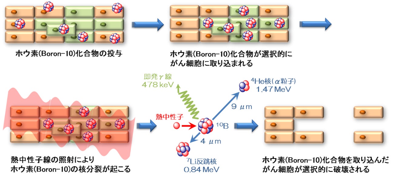 BNCTは、がんの放射線治療の一種であり、その治療法は、がん患者にBNCT用ホウ素薬剤を投与することで、がん細胞内にホウ素(Boron-10)を選択的に取り込ませ、体外からエネルギーの低い中性子を照射するというものです。