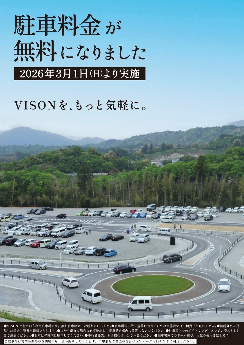 2026年3月1日(日)より、VISON施設内の駐車場を無料でご利用いただけるようになりました。